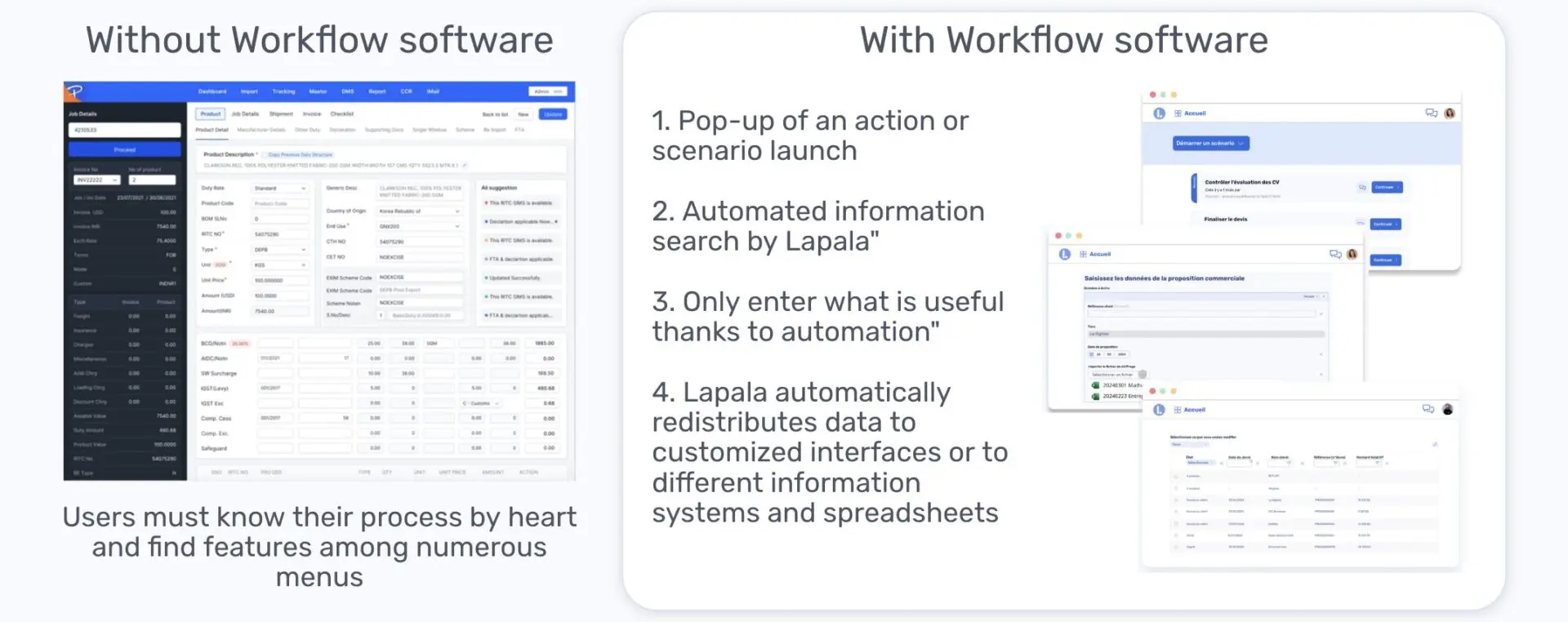 Without workflow software, you have to click and cut and paste. With a workflow tool, you click once and enter information with high added value. The workflow software automatically completes the information with less added value and then updates all the software (thus avoiding multiple entries).